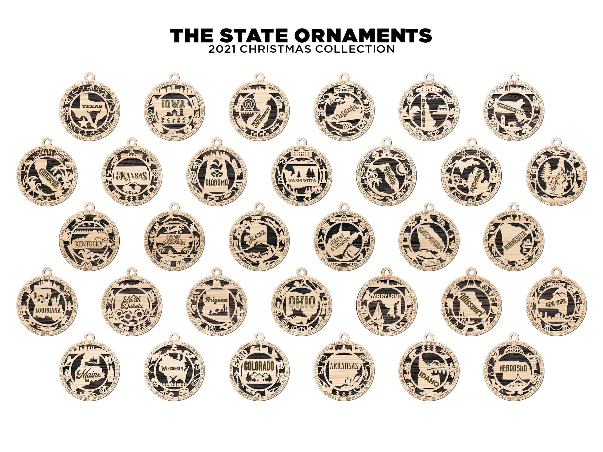 Share some hometown pride this Holiday Season with a hand-crafted State ornament that showcases what your state has to offer with whimsical icons and words. Send the perfect gift to someone living out of state as a beautiful reminder or collect them for each state that you lived in or visited. In total there are 52 designs to fill your tree with hometown pride this Holiday season.